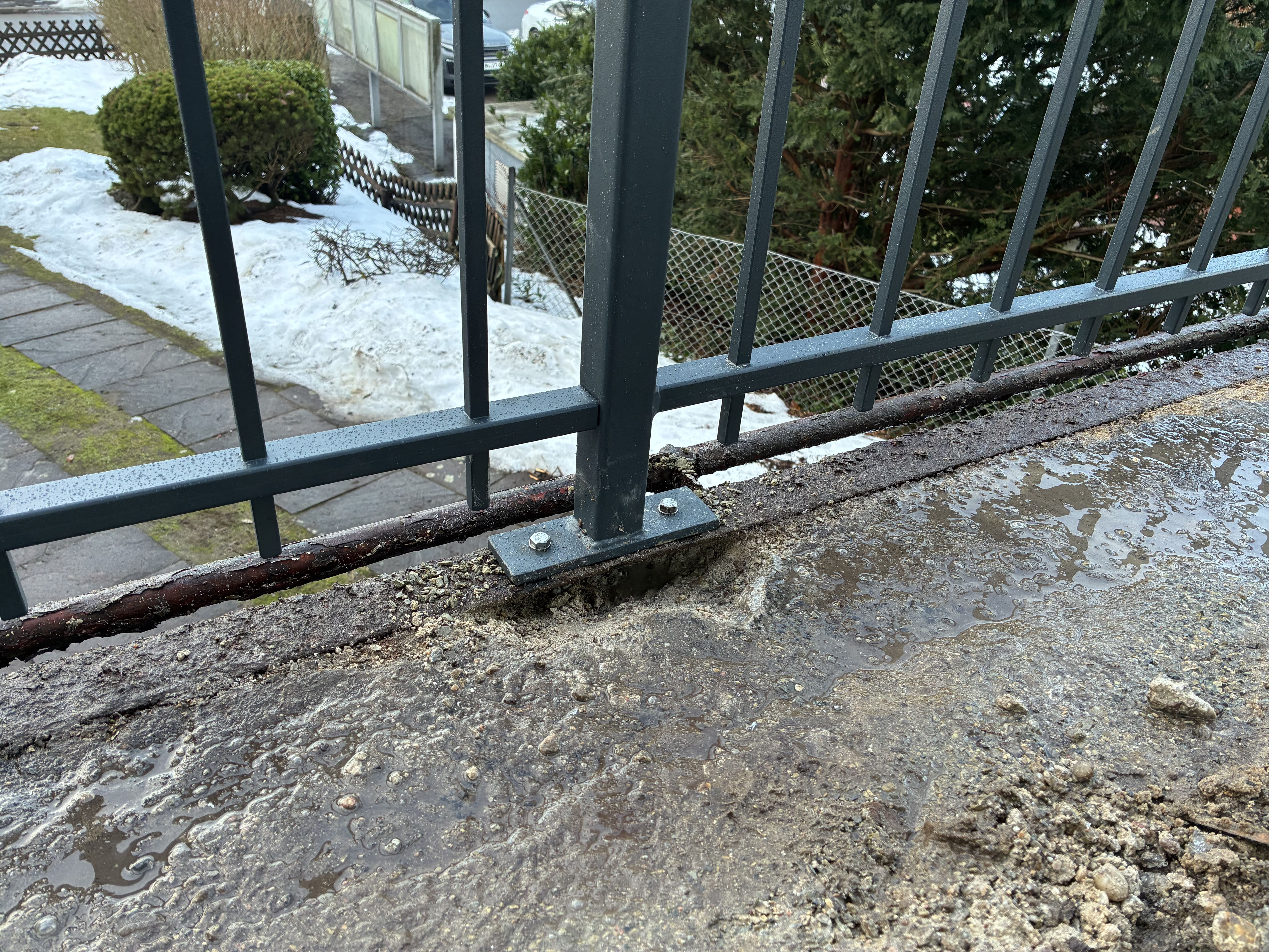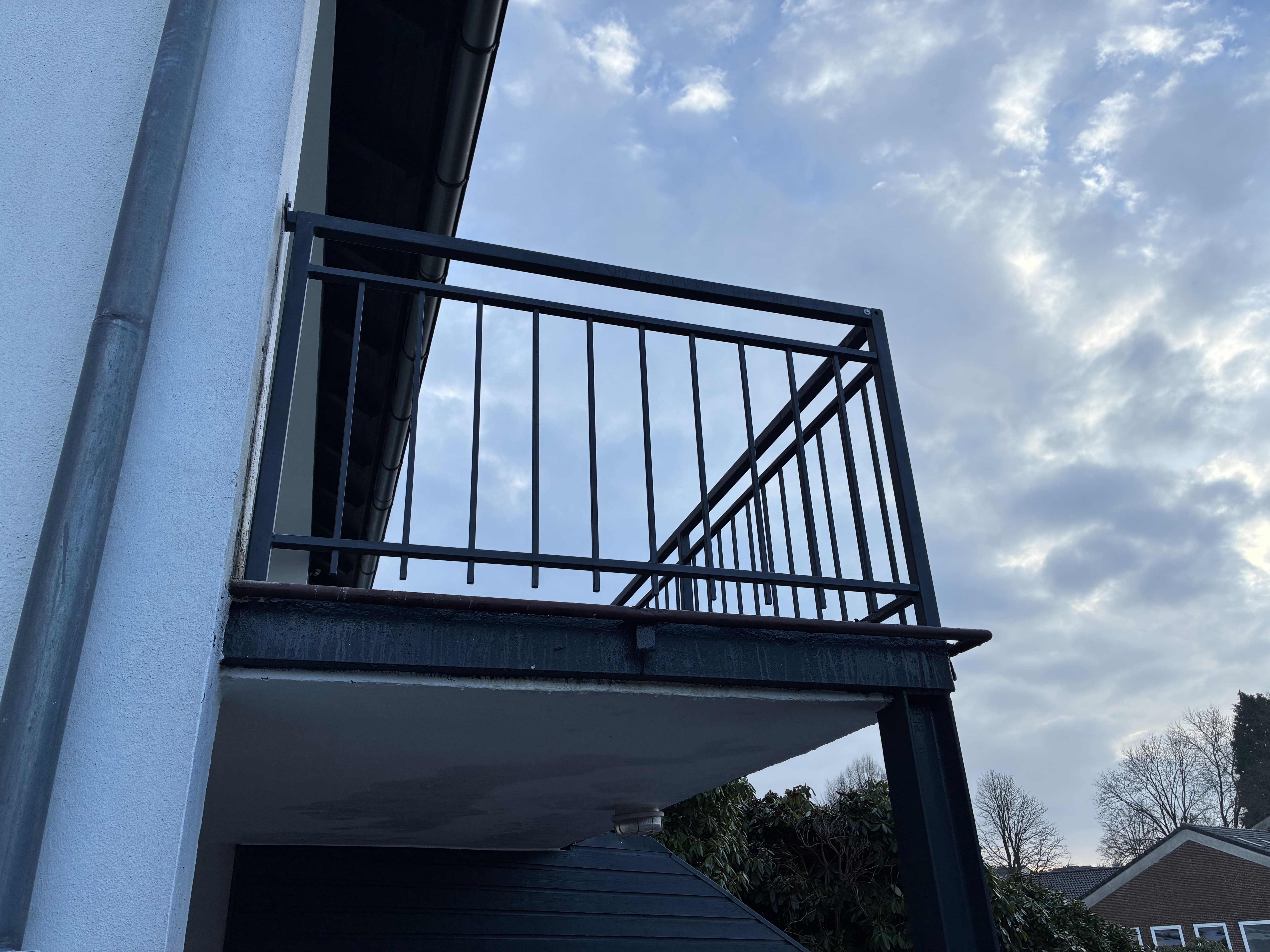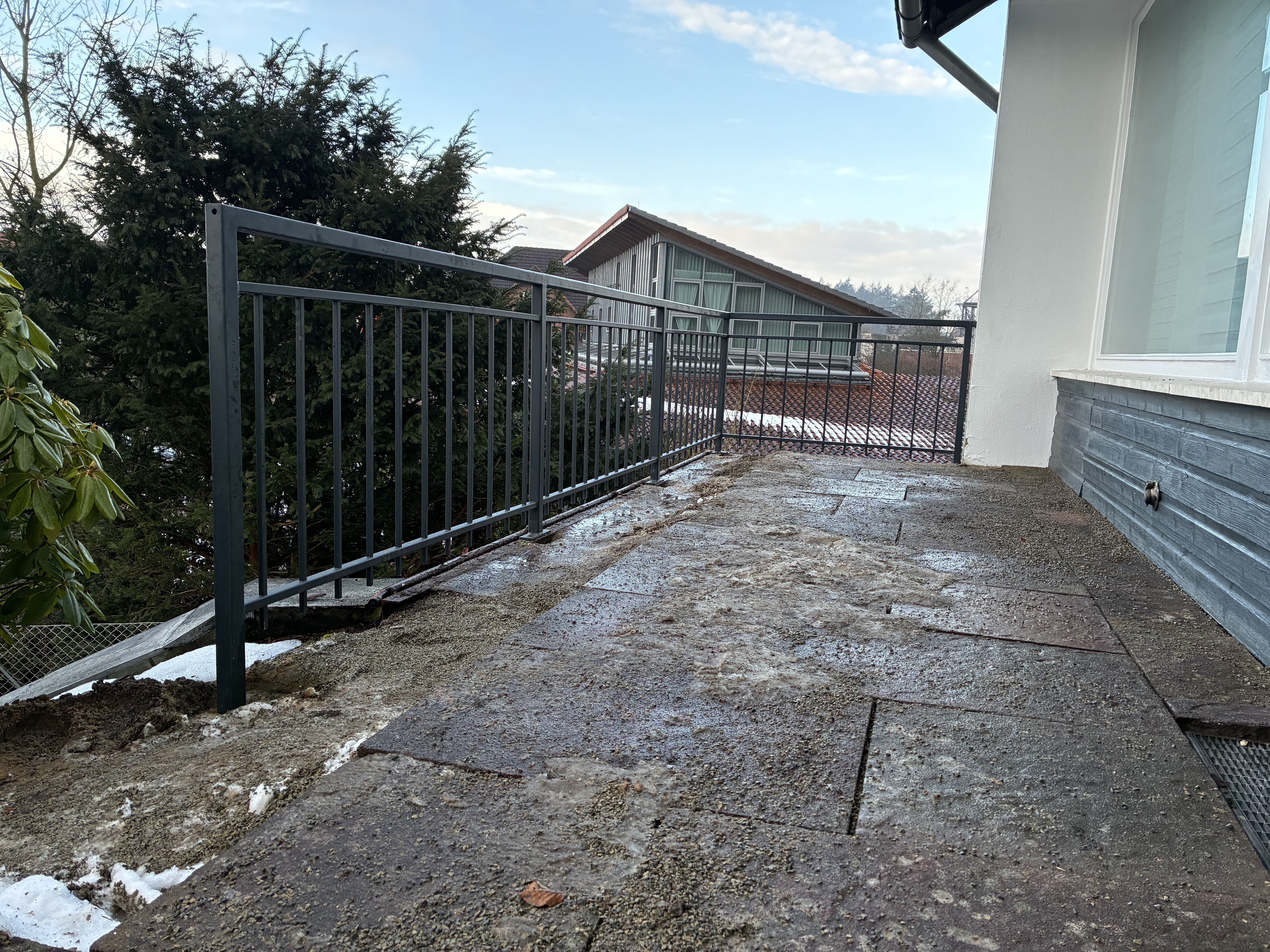 Maßgefertigtes Stabgeländer mit vertikalen Füllstäben für eine erhöhte Terrasse über der Garageneinfahrt – sicher auf Bodenplatten verschraubt und passend zur modernen Gebäudeoptik.