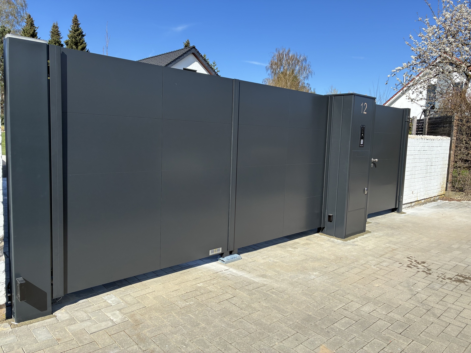 Hochwertige Tor- und Zutrittsanlage von Holler mit elektrisch betriebenem Drehtor in Glattblechoptik und Linienfräsungen. CAME-Torantrieb, separate Gehtür mit E-Öffner, Briefkastensäule mit Paketfach, beleuchtete Hausnummer sowie AES-Global-Sprechanlage zur Steuerung beider Zugänge. Ein BFT-Elektroschloss bietet zusätzliche Sicherheit bei längerer Abwesenheit.